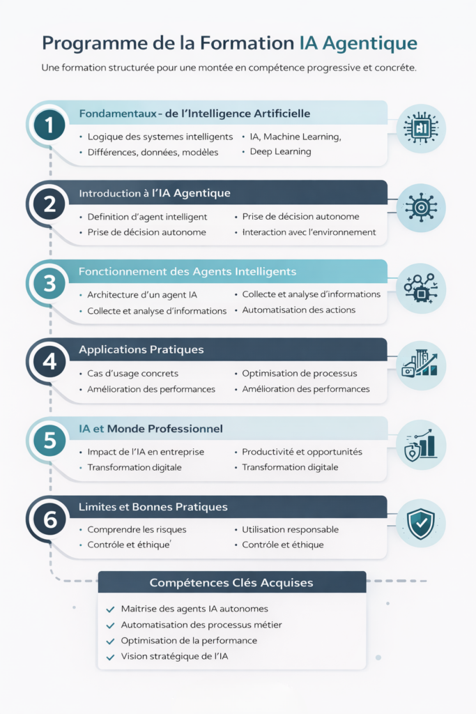La formation IA Agentique de YAXI offre une approche structurée et pragmatique des systèmes intelligents capables d’agir, décider et interagir de manière autonome. Elle permet aux participants de dépasser la simple découverte technologique pour développer une véritable compréhension opérationnelle de l’IA.